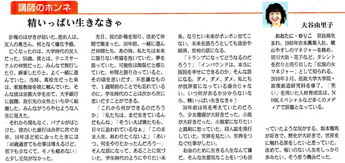 また、2005年にスタートした【講師塾】では、年間1億円のオファーに応える大谷流の講演・研修ノウハウを惜しげもなく公開。日本で初めて講演を科学するアプローチを用いた講師塾には、オリンピックのメダリストや元Jリーガー、教師、経営者、人事担当者、労働組合の執行部、士業、デザイナー、政治家など、その受講者は、1,400人を超える。